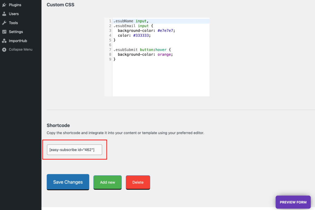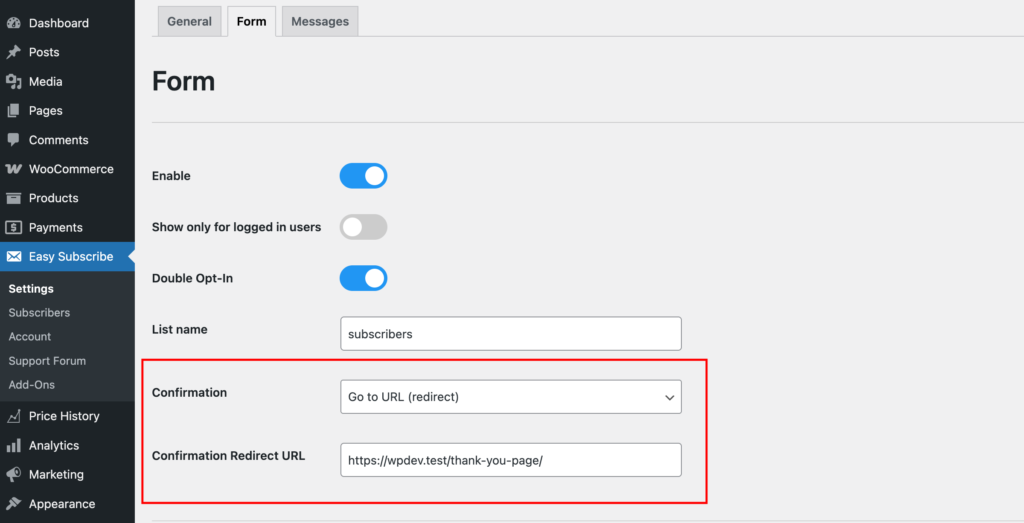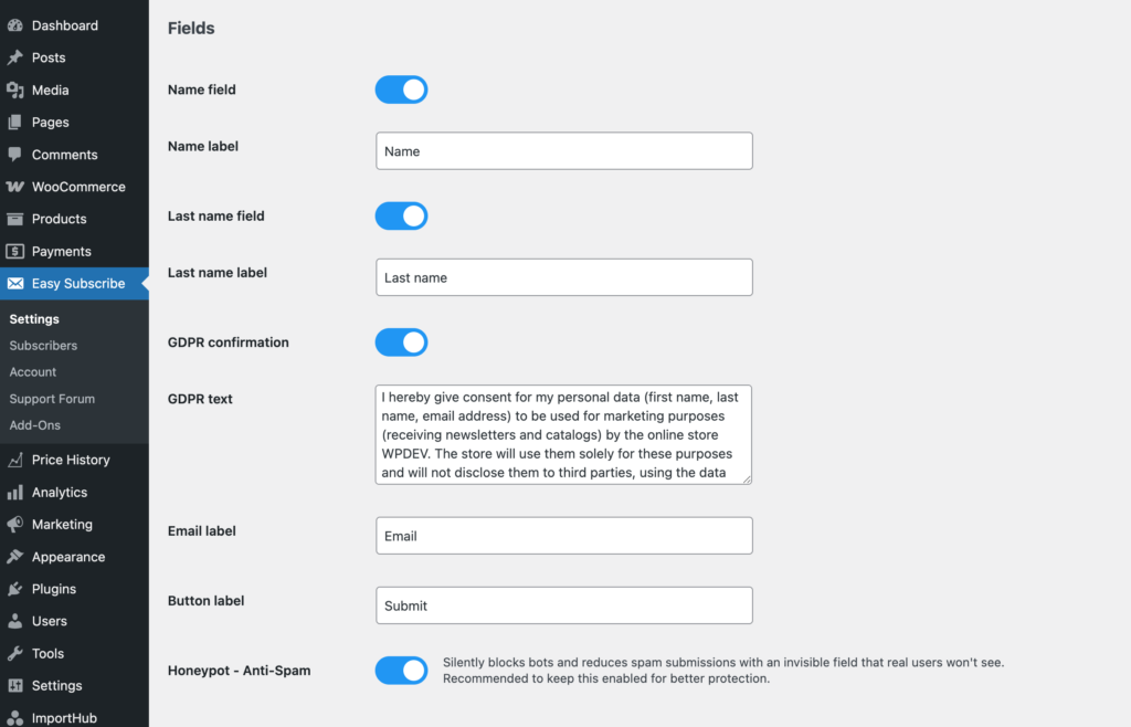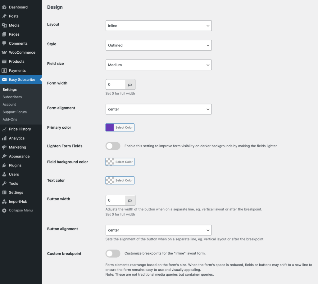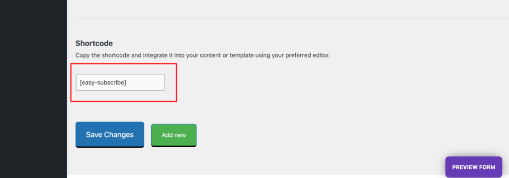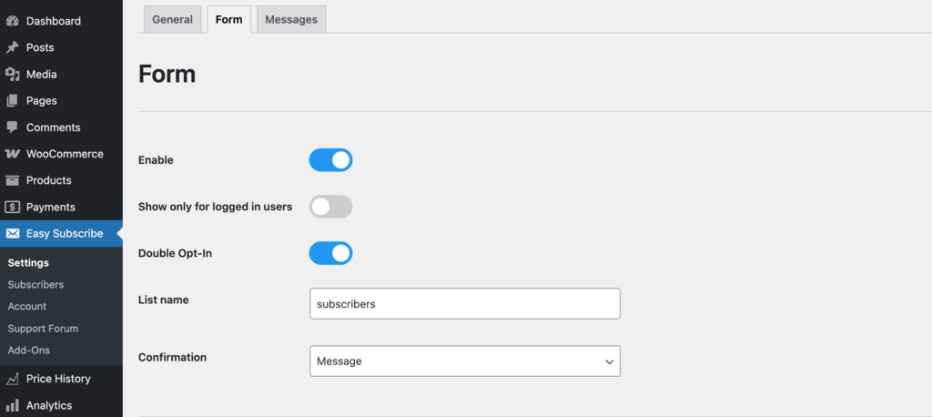 After installing and activating the plugin, go to Easy Subscribe → Settings in your WordPress dashboard. Under the Form tab, you’ll find everything you need to customize your subscription form.