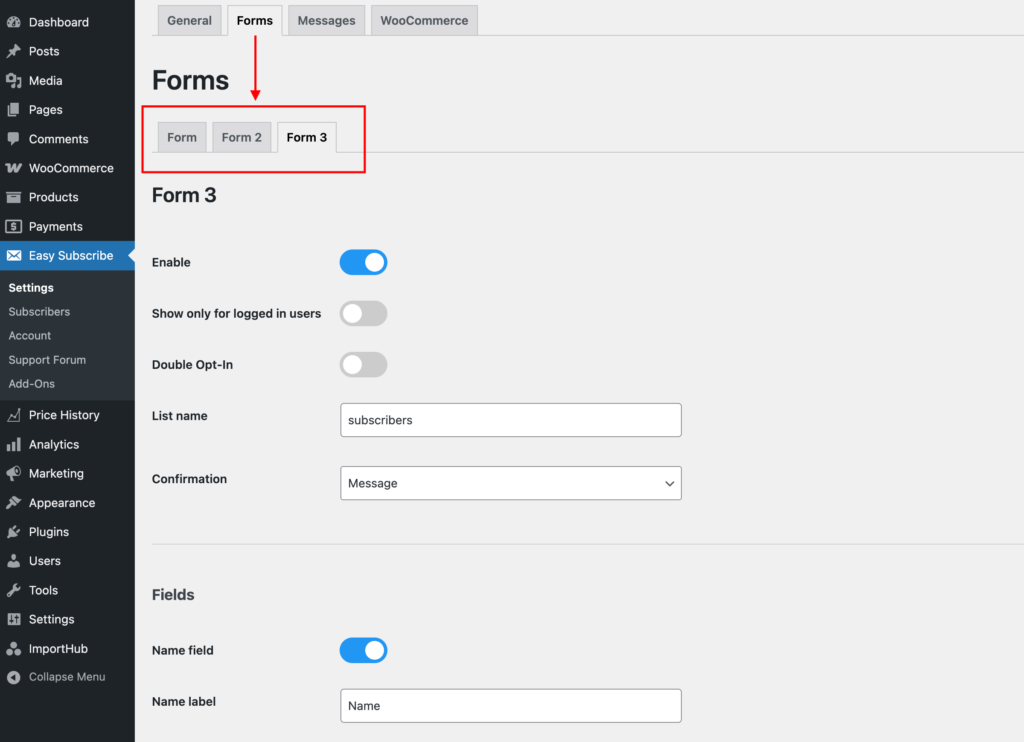 Under the Easy Subscribe → Forms tab, you’ll see a subtab for each form. These contain individual settings so you can customize each form separately.