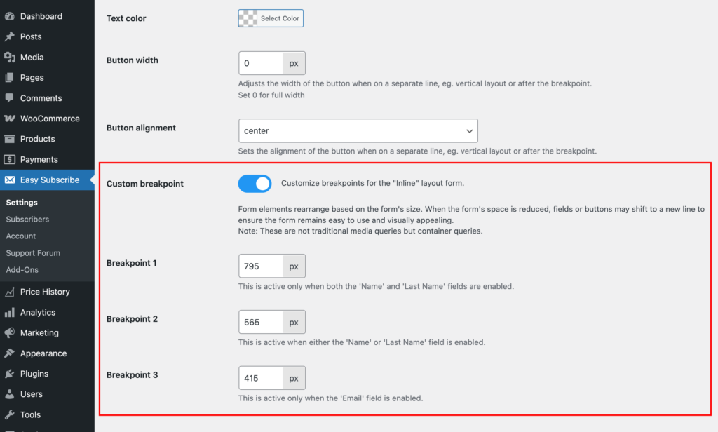 Applies when only the Email field is enabled. Controls when the button drops to its own line for better spacing.