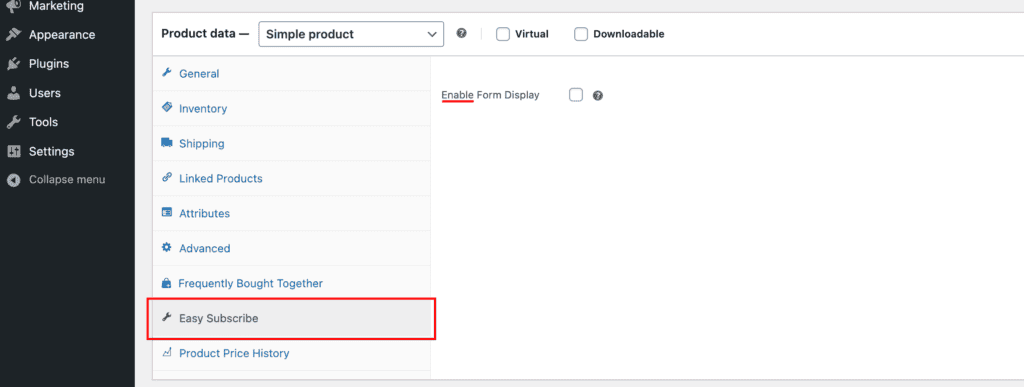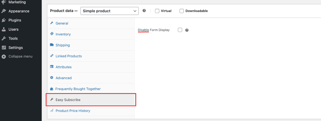 Depending on your selection, a checkbox will appear in the Easy Subscribe tab on the product edit screen, allowing you to enable or disable the form per product.