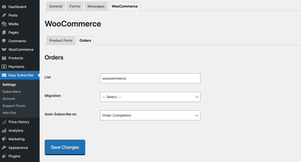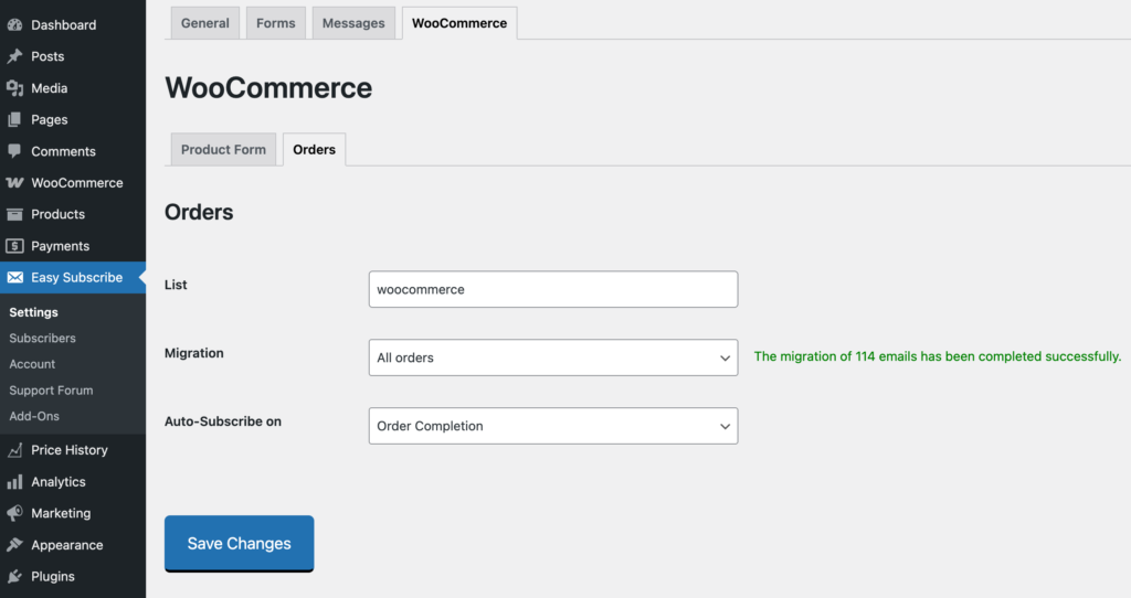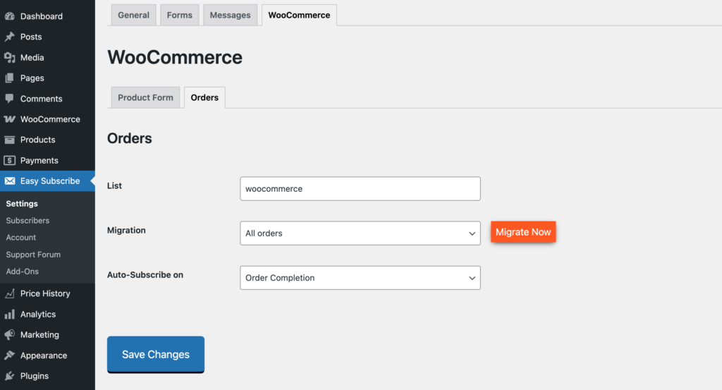 The Migration tool allows you to import billing emails from existing orders into the defined subscription list. It copies billing emails from orders, helping you quickly build your email list from past purchases.