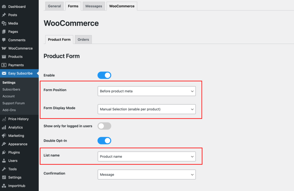 Manual Selection – The form is disabled by default. You can enable it for specific products in the Easy Subscribe tab when editing a product.