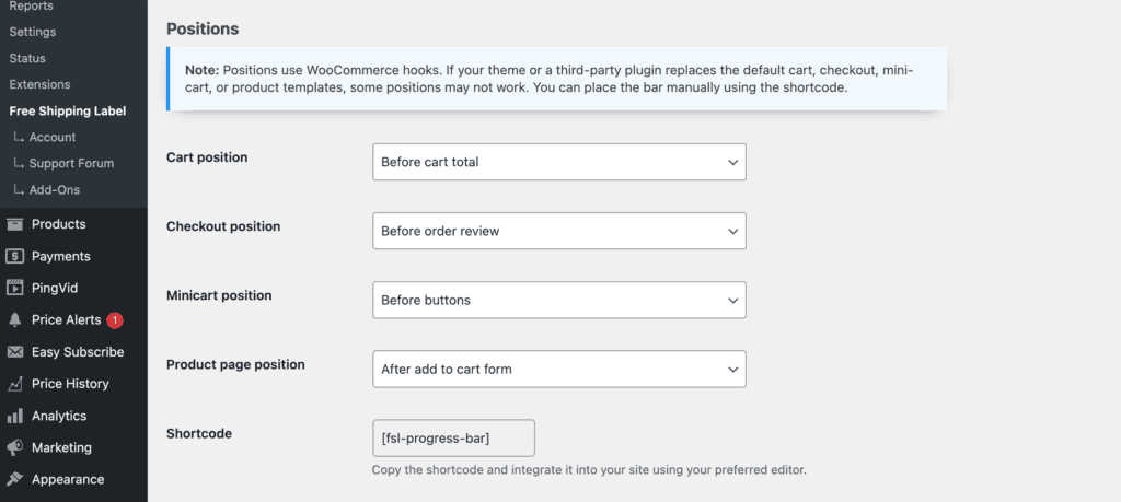 In the PRO version, additional options are available, including compatibility with popular cart plugins like FunnelKit, WPC Fly Cart, Side Cart, and Elementor. When a compatible plugin is detected, you can customize the progress bar position, such as at the top, above or below products, or above or below buttons.