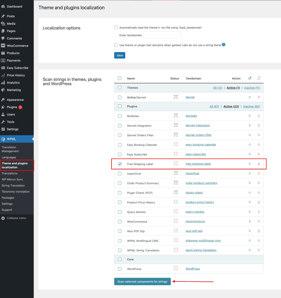 1. Go to WPML → Theme and plugins localization in your WordPress dashboard.