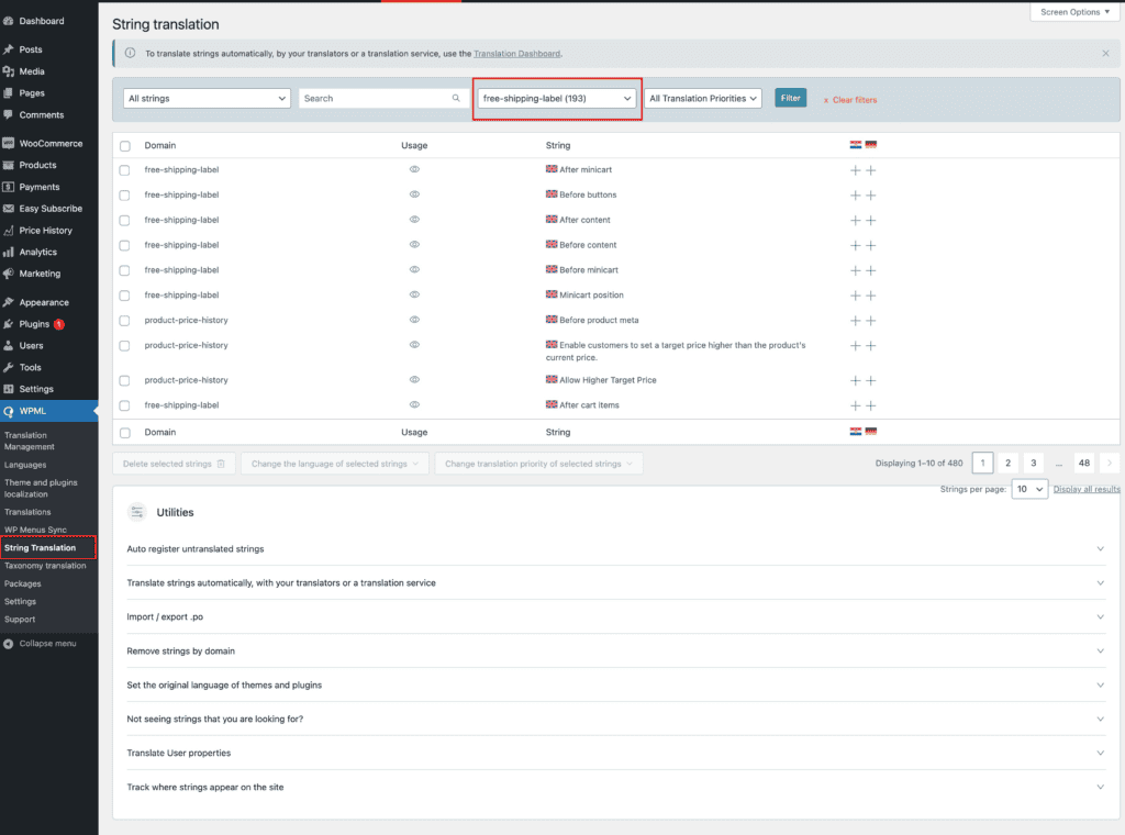 2. In the Strings in the plugins section, find either Free Shipping Label or Free Shipping Label (Pro).