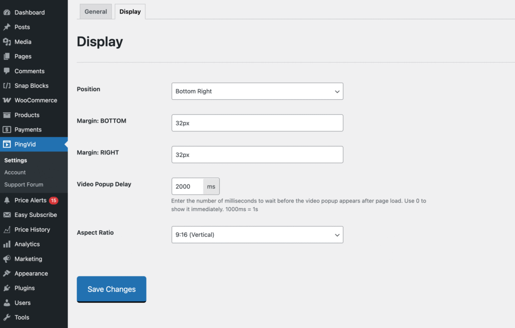 This section lets you control where and how the floating video widget appears on the screen. Adjust position, margins, timing, and aspect ratio to best fit your site’s layout.
