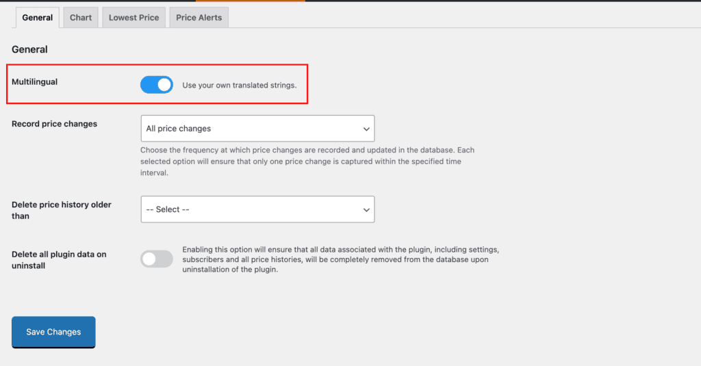 To ensure that translated strings are displayed instead of the default texts configured on the settings pages, you must enable the Multilingual option in our plugin. This option can be found in the General Settings section.