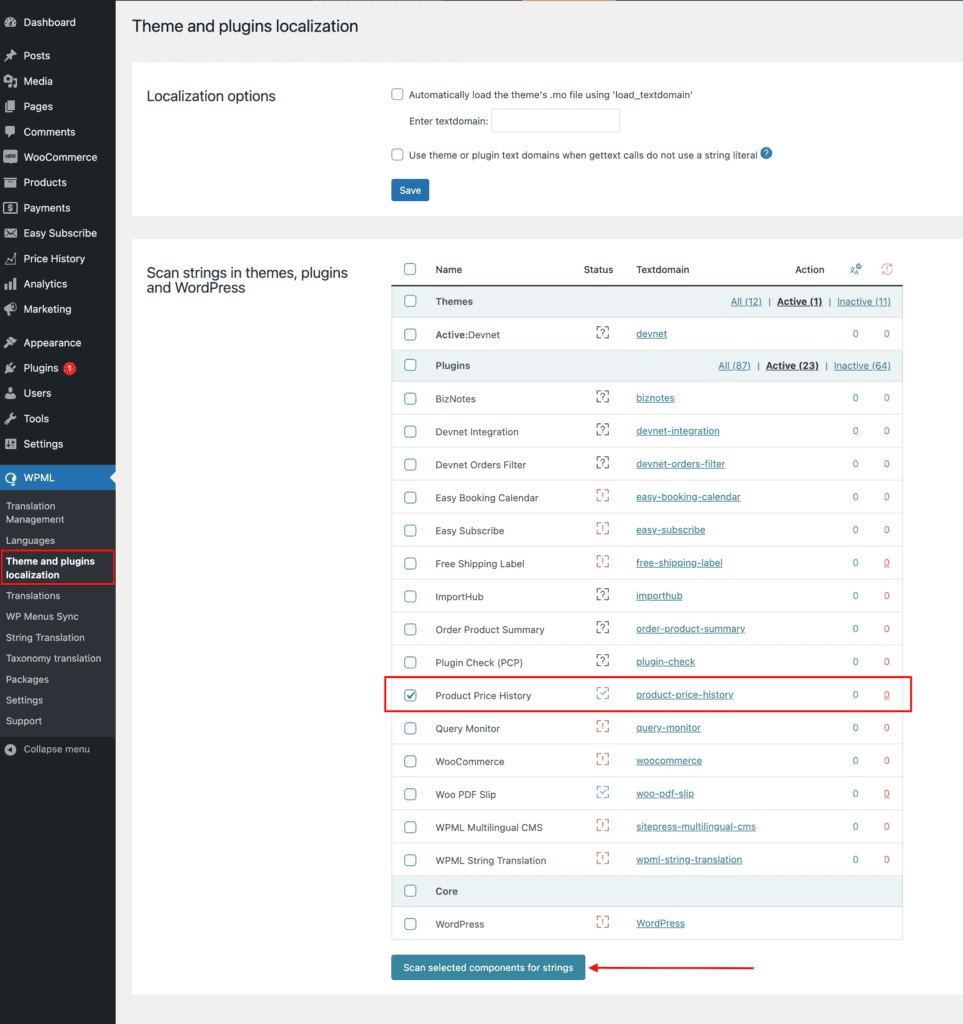 1. Go to WPML → Theme and plugins localization in your WordPress dashboard.