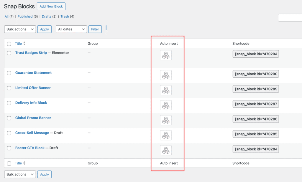 Auto Insert allows you to automatically place a Snap Block in specific locations across your site — without using shortcodes or manually adding widgets.