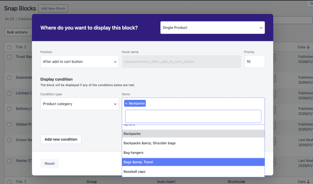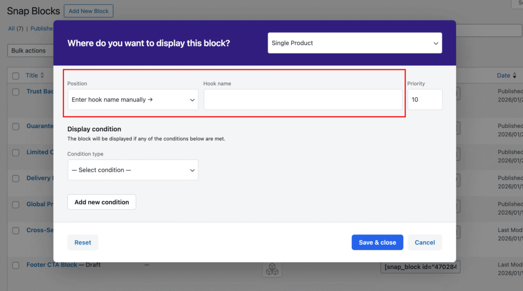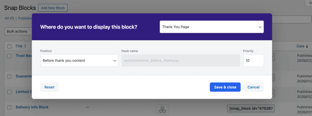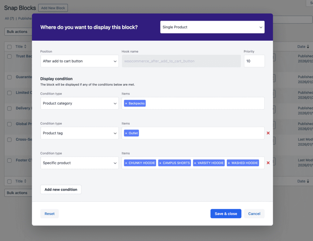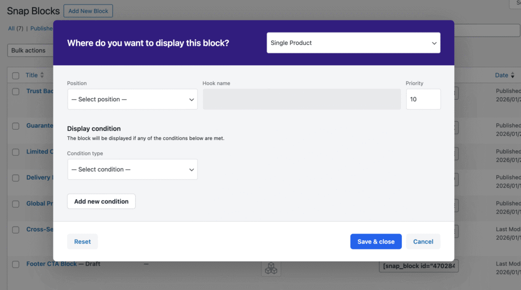 Instead of inserting blocks page by page, you choose where the block should appear and under which conditions, and Snap Blocks handles the rest. This makes it easy to display content in consistent positions such as product pages, checkout, thank-you pages, blog posts, or specific pages — all from one central place.