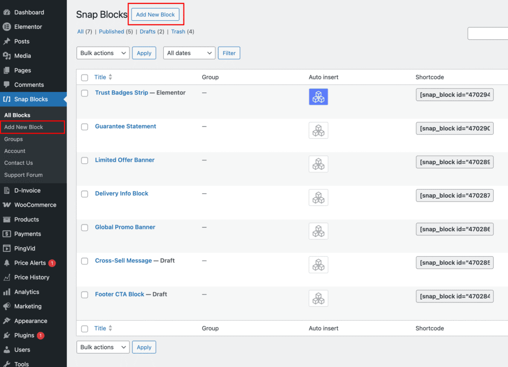 - Go to Snap Blocks → Add New Block