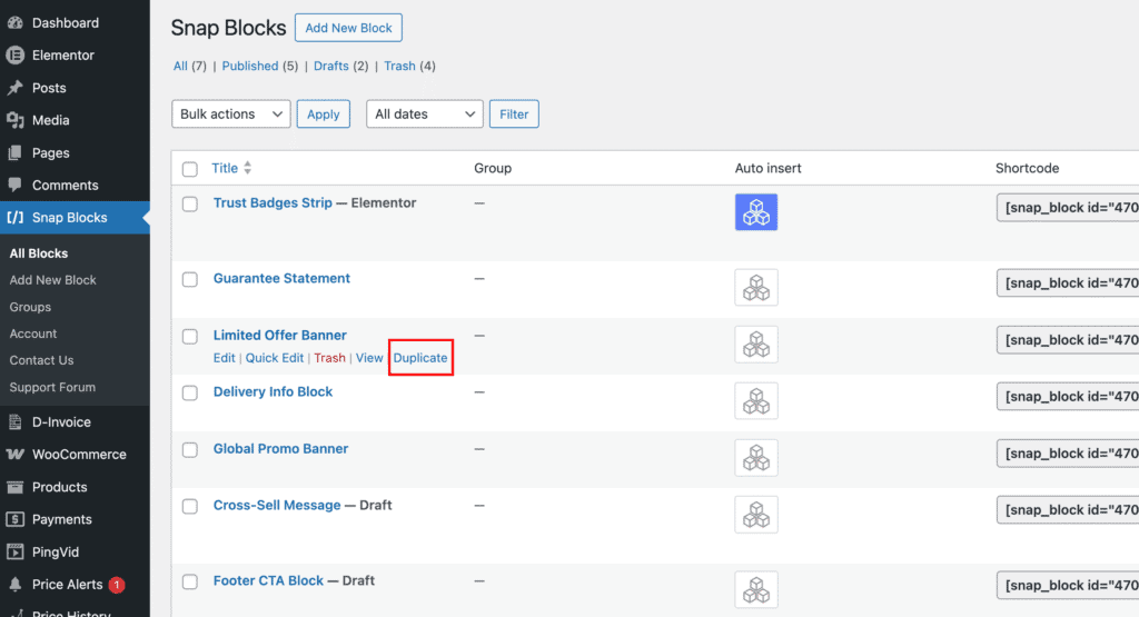 When hovering over a block in Snap Blocks → All Blocks, you’ll see the Duplicate link alongside Edit, Quick Edit, View, and Trash.