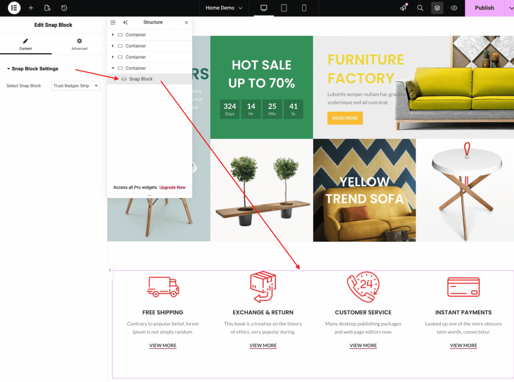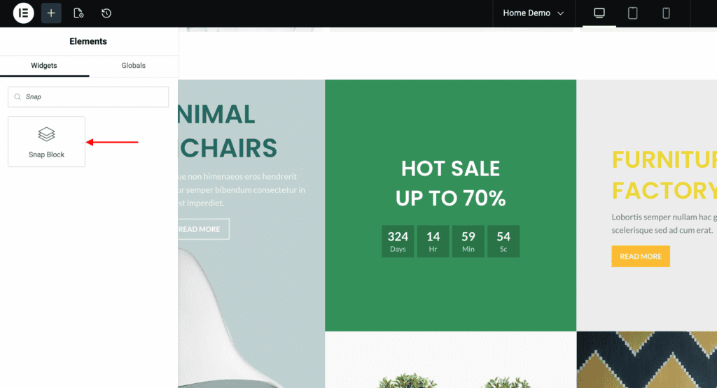 - In the widgets panel, search for Snap Blocks