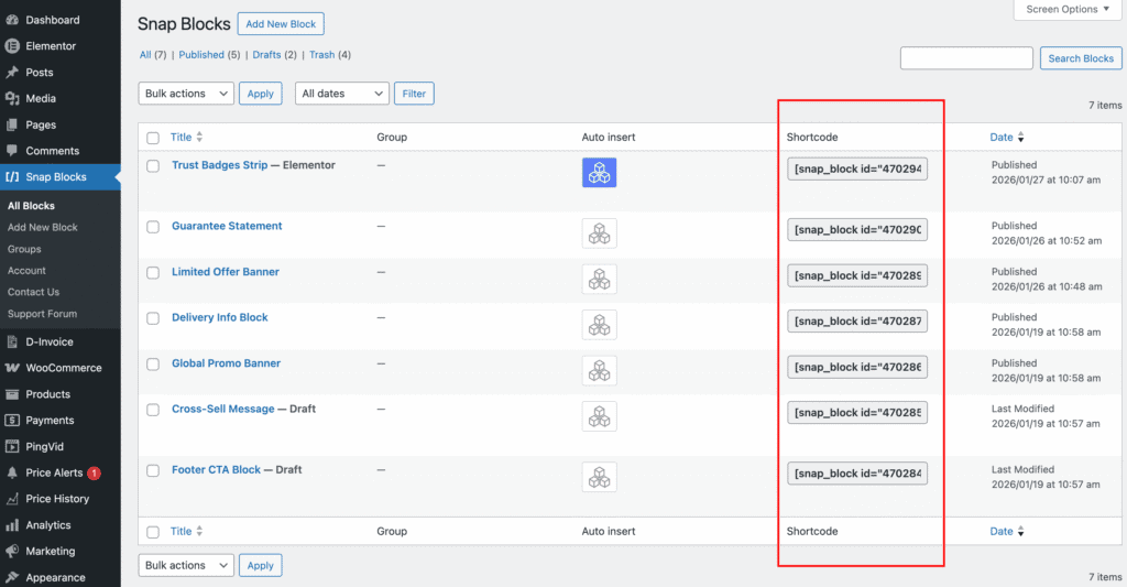 Each Snap Block has its own shortcode, visible in the Snap Blocks list in the admin. This shortcode can be copied and pasted anywhere the editor supports shortcodes.