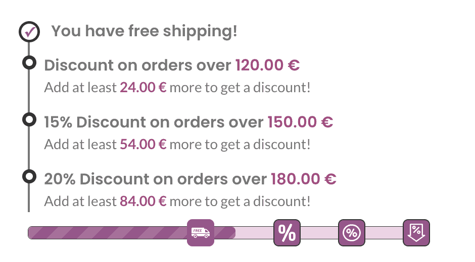 The PRO version allows for the implementation and customization of the Free Shiping Progress Bar – a niche solution for increasing total purchases and order values. You will be eligible for the PRO version automatic updates since we are constantly improving and adding new features to the plugin!