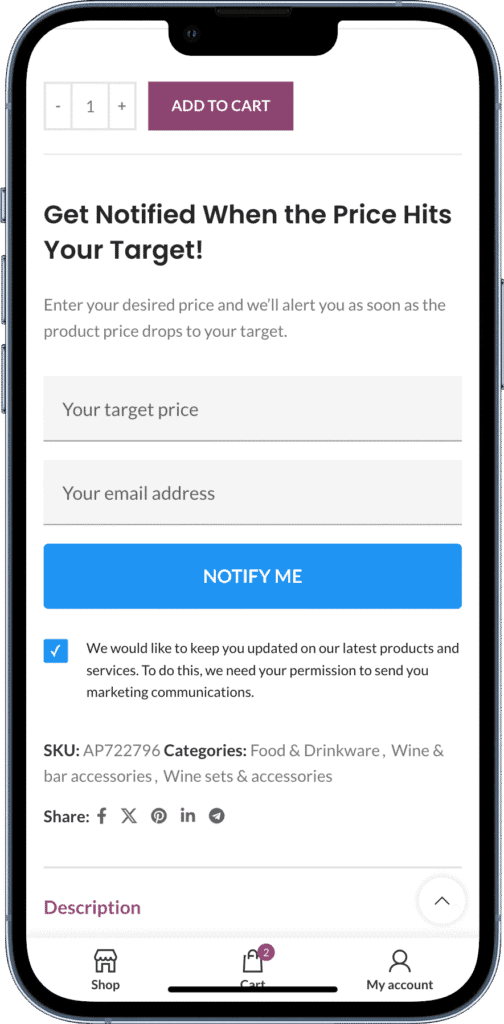 With Price Alerts, shoppers can subscribe to price drops in just a few taps—right from the product page. They set their ideal price, enter an email, and relax. You capture warm leads automatically, no extra steps.